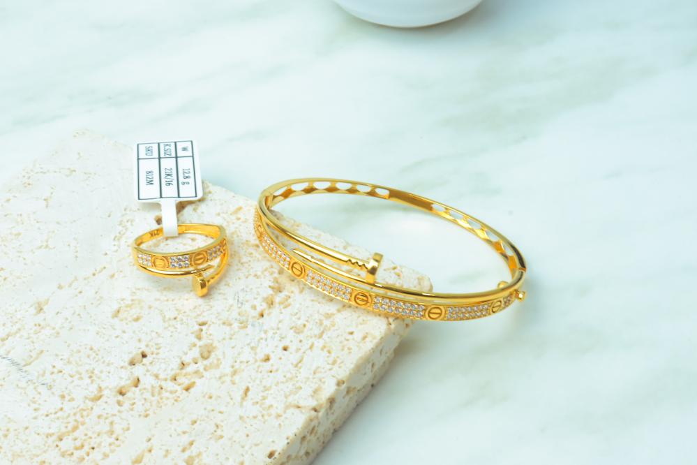 - التصميم: تصميم فاخر بأسلوب المسمار المستوحى من موديلات كارتير الشهيرة. تتميز الاسوارة والخاتم بتصميم عصري جريء يجمع بين البساطة والفخامة، لتضفي لمسة من الرقي على إطلالتك. هذه القطعة تجمع بين الجودة العالية واللمسات الفنية، مما يجعلها مثالية للمناسبات الخاصة أو لإضافة لمسة مميزة إلى مظهرك اليومي.