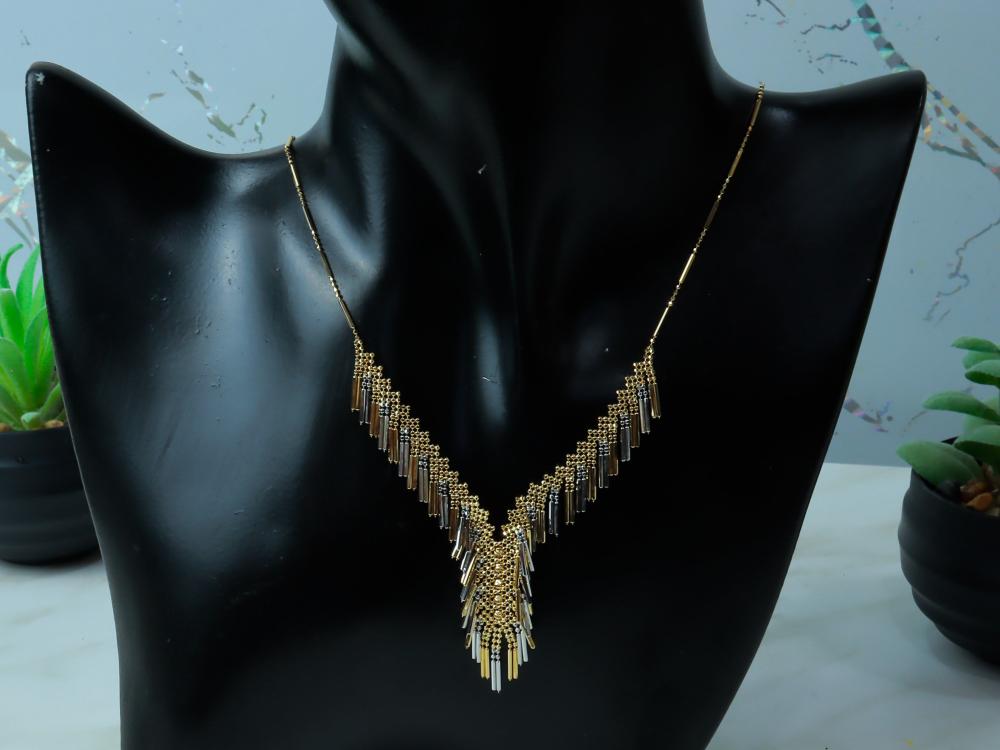 لعاشقات الأناقة والتصاميم الفريدة، نقدم لكِ عقد ذهب فخم بتصميم ياباني رائع. مصنوع من ذهب عيار 18، بوزن 7.6 جرام. يتميز هذا العقد بالدقة والتفاصيل الفاخرة المستوحاة من الفن الياباني، مما يجعله إضافة مميزة لمجموعتك من المجوهرات.
