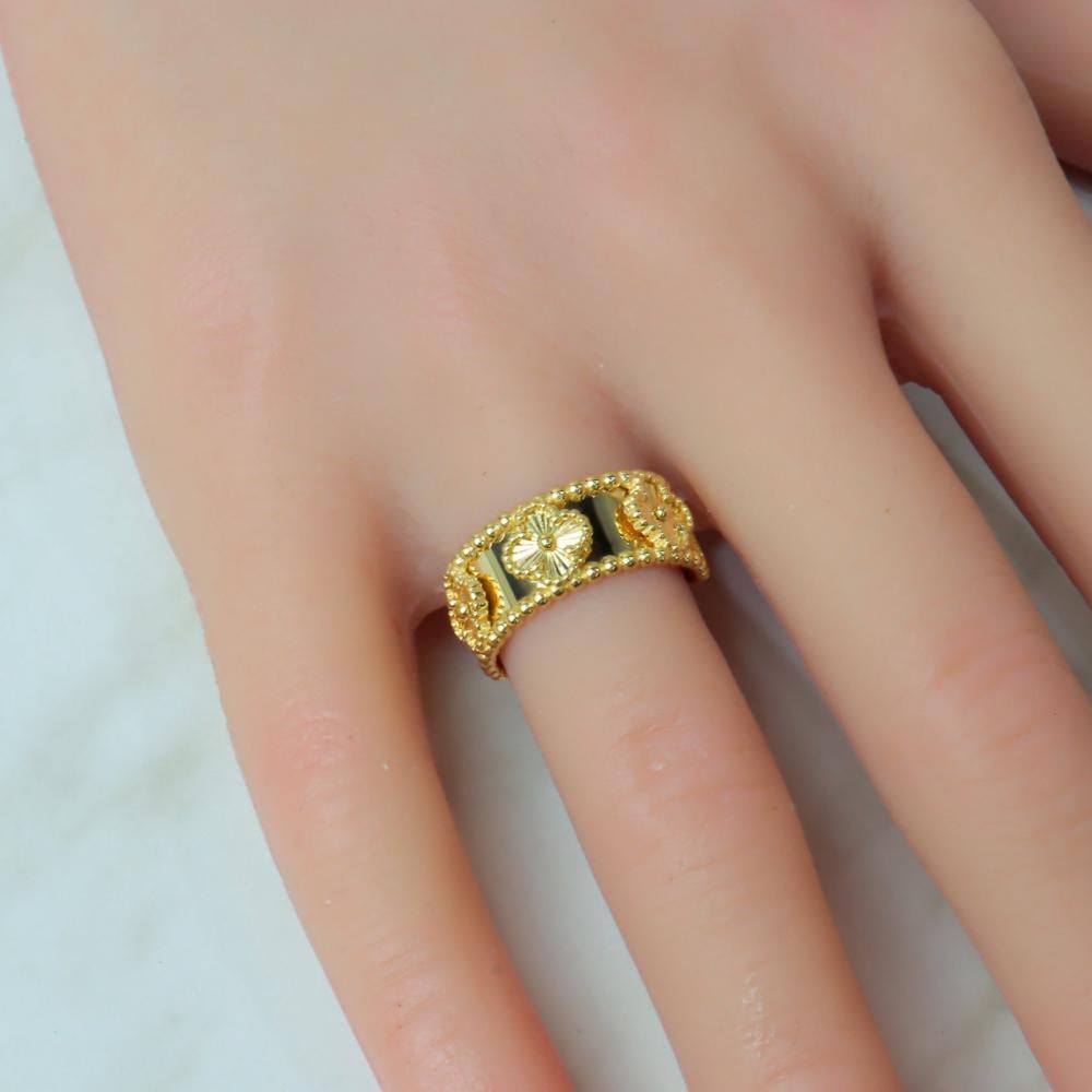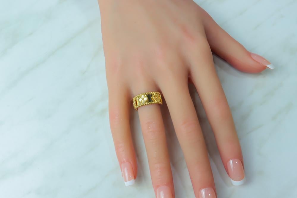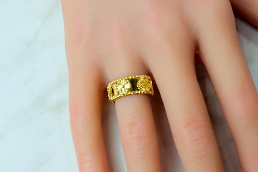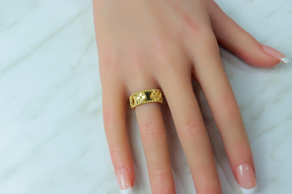 خاتم فان كليف ذهب عيار 18 صافي بوزن 3.6 جرام. يتميز هذا الخاتم بتصميمه الرائع المستوحي من علامة فان كليف الشهيرة الذي يعكس الأناقة والتفرد، يأتي بتصميم نقي وبسيط يبرز جمال الذهب الخالص ويضيف لمسة من الفخامة لأي إطلالة. مثالي للمناسبات الخاصة أو للاستخدام اليومي، سيجعل من يدك بريقاً خاصاً.