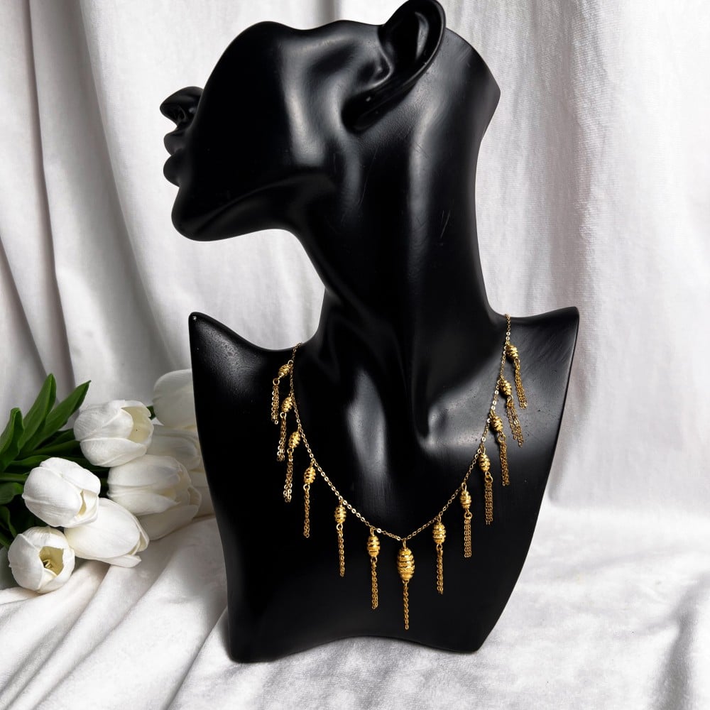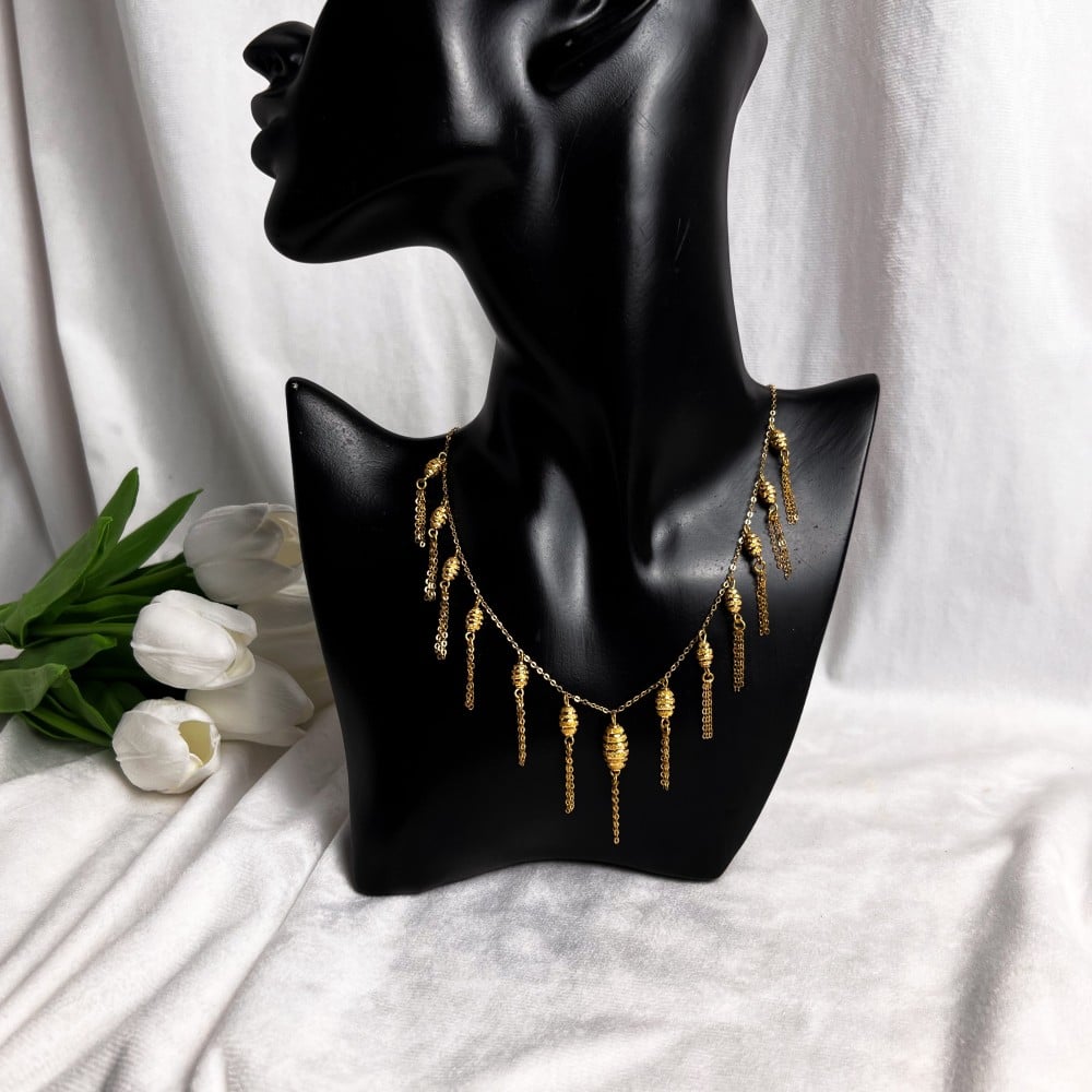 مخنق ذهب كرات الدوريكاء المميزة عيار 21 بوزن 14.4 جرام, مضاف اليها شلاشل لاضافة لمسة ساحرة لعنقك, ثقيل ومناسب جدا للاهداء والاقتناء ,مفعم بنعومة الذهب الصافي من العيار 21