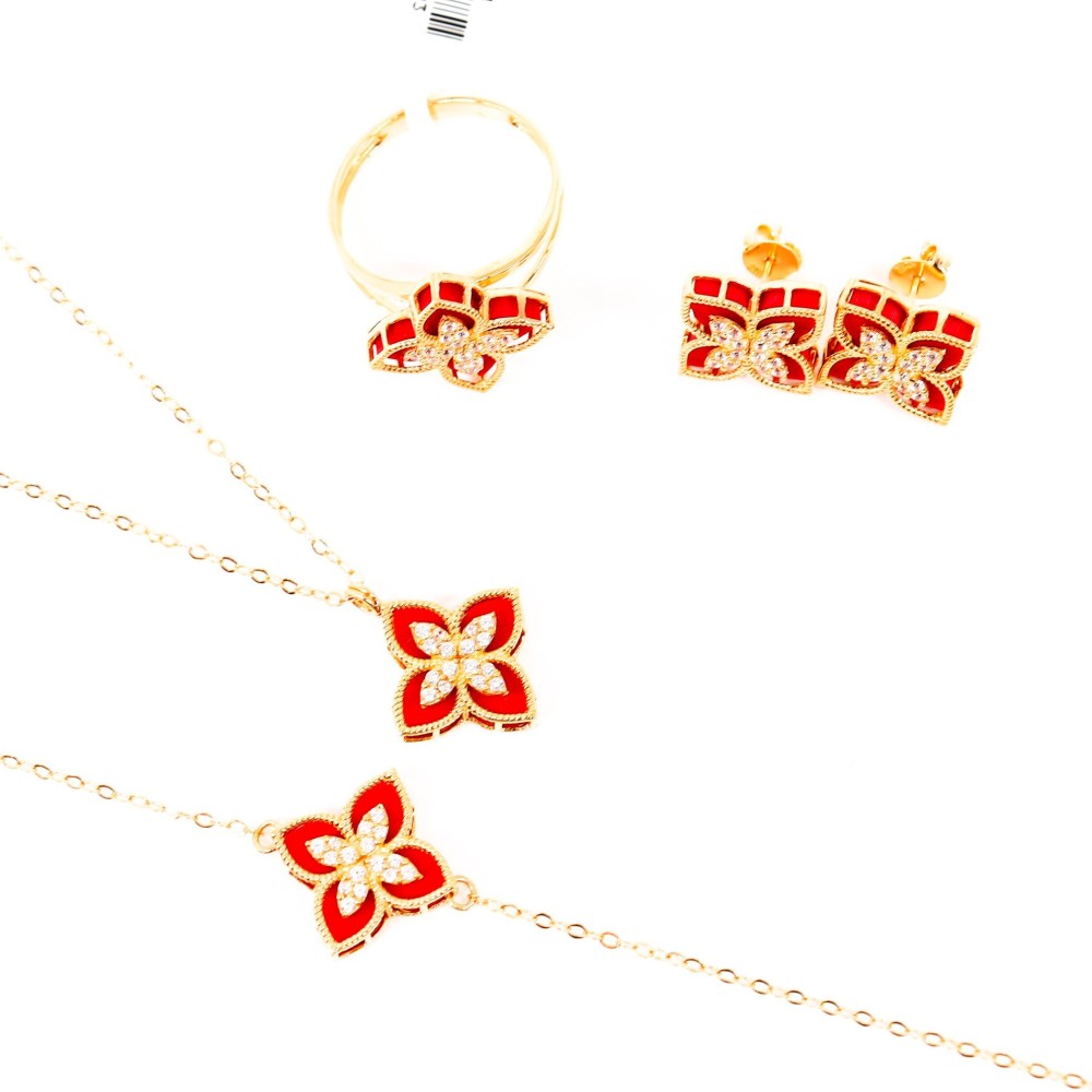 عطايا الملوك تأتي من قيمتهم، وكلُ يأتي بقيمته من جعُبته، لذا فإن هديّتنا للملكة الرقيقة هبت علينا من شرق أوروبا، من بلاد الذهب طقم من مجموعة روبيرتو كوين نقدم إليكِ طقم مختلف عيار 21 سلسال، قرط، خاتم، إسوارة.