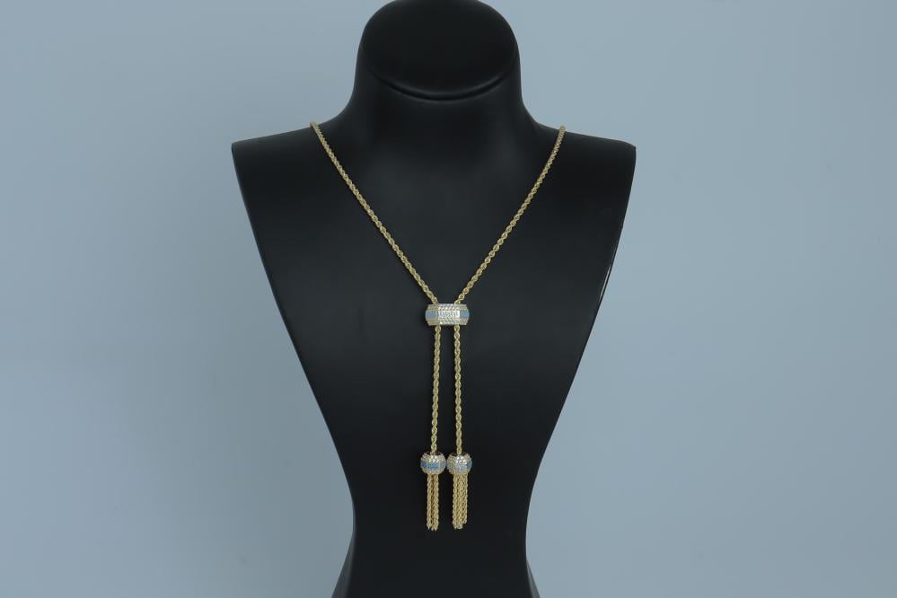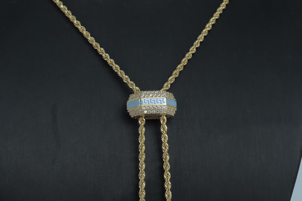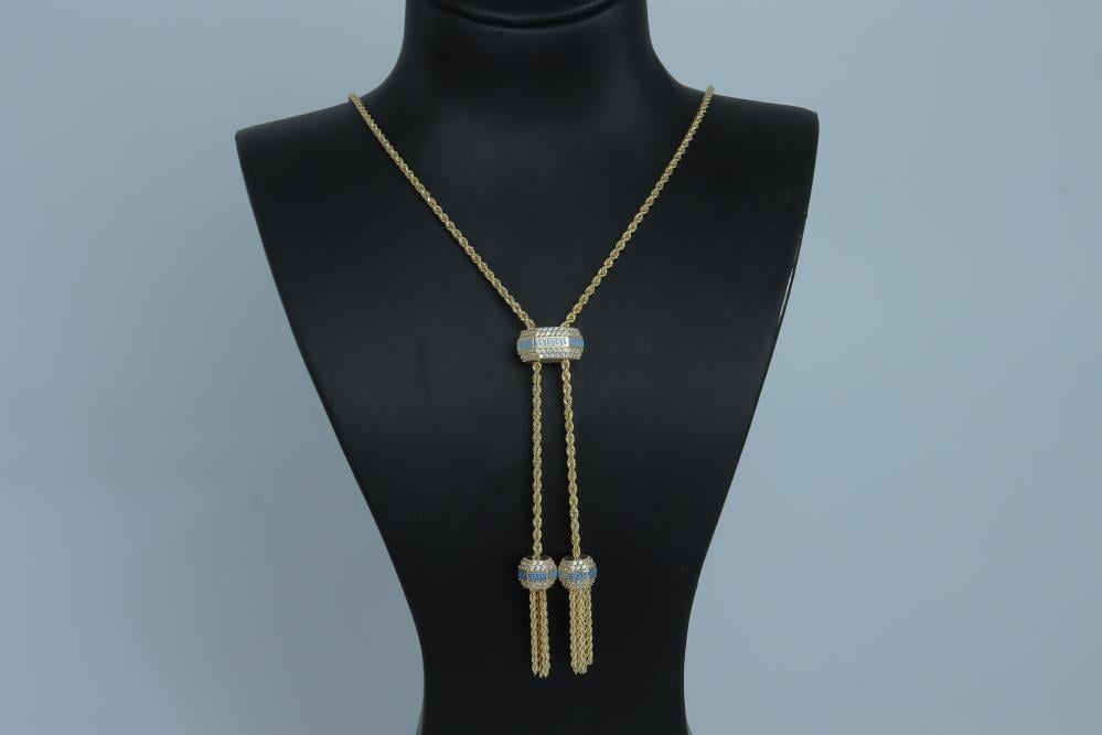 سبحة المبروم بتصميمها الجديد كليا المطعمة بلون الميناء التيفاني بتصميم الماسي عيار 18 مزودة بكره السحب التي تسمح لك بالتكبير والتصغير من طول 40 سم الى طول 75 سم