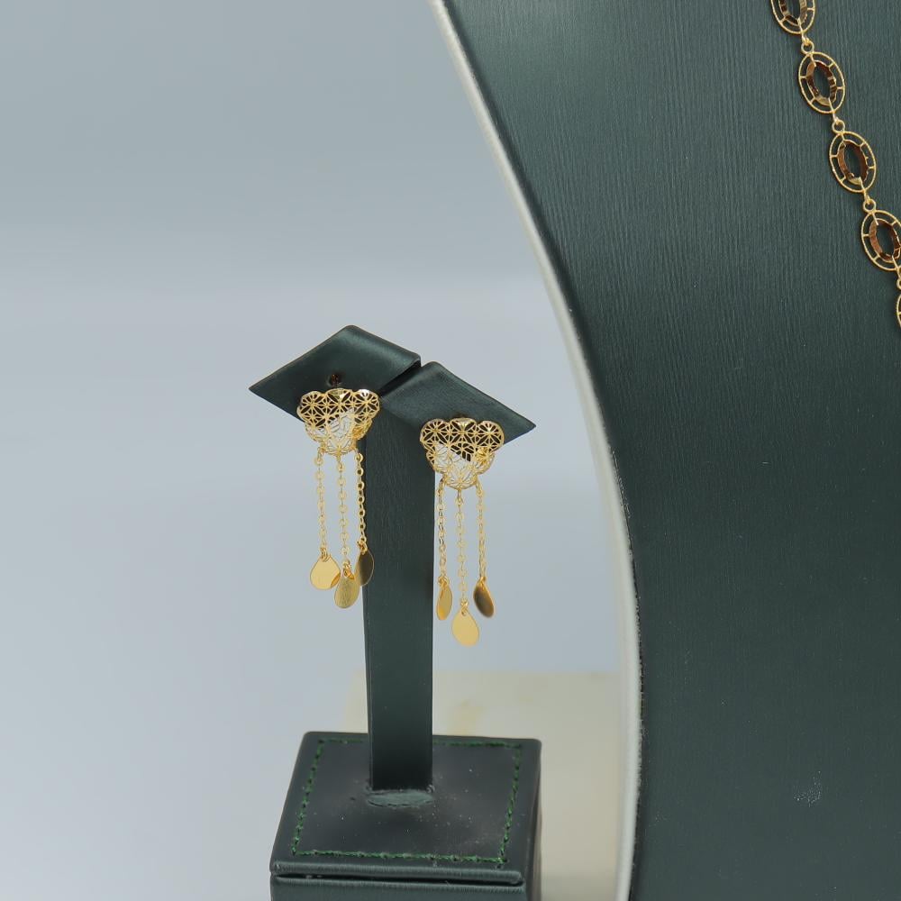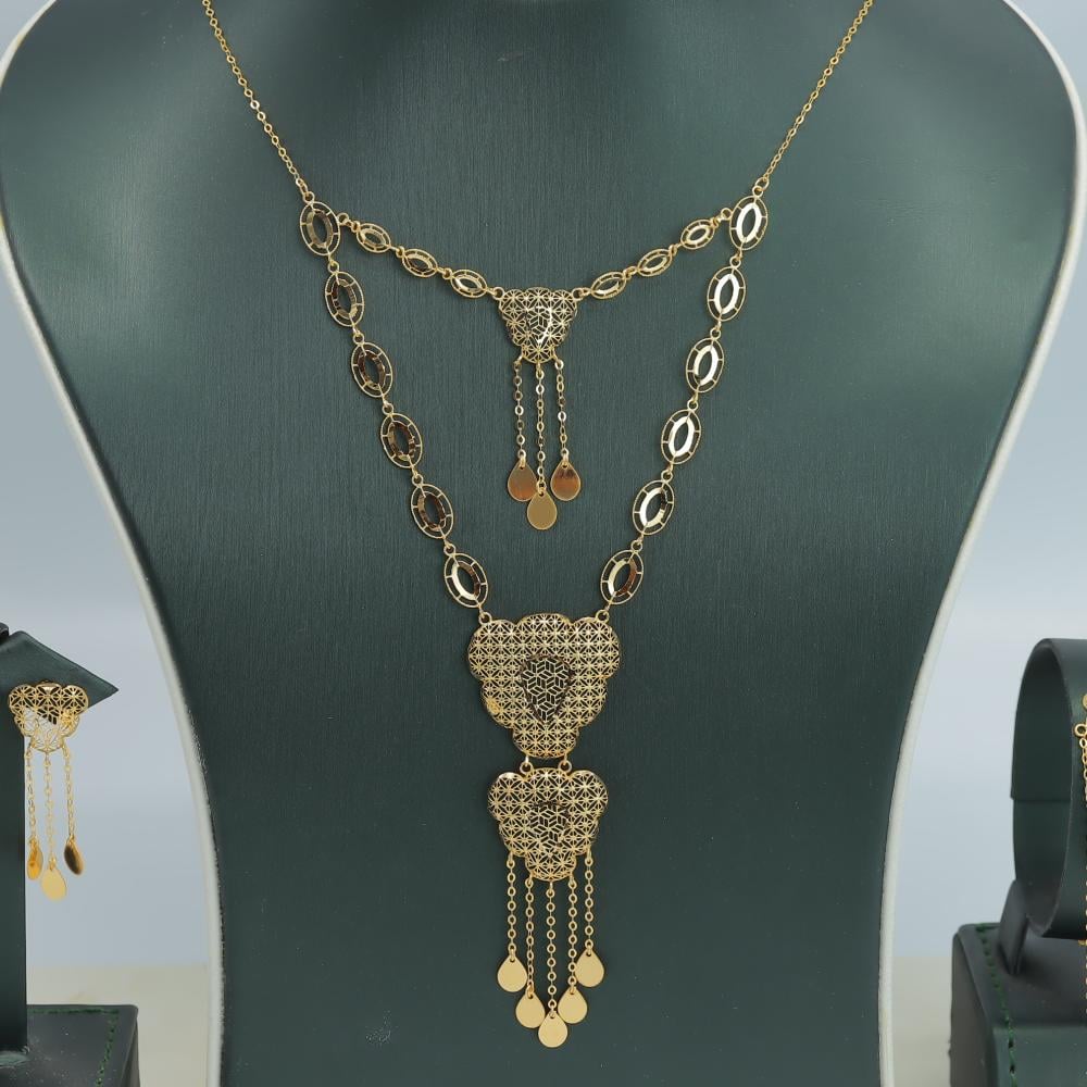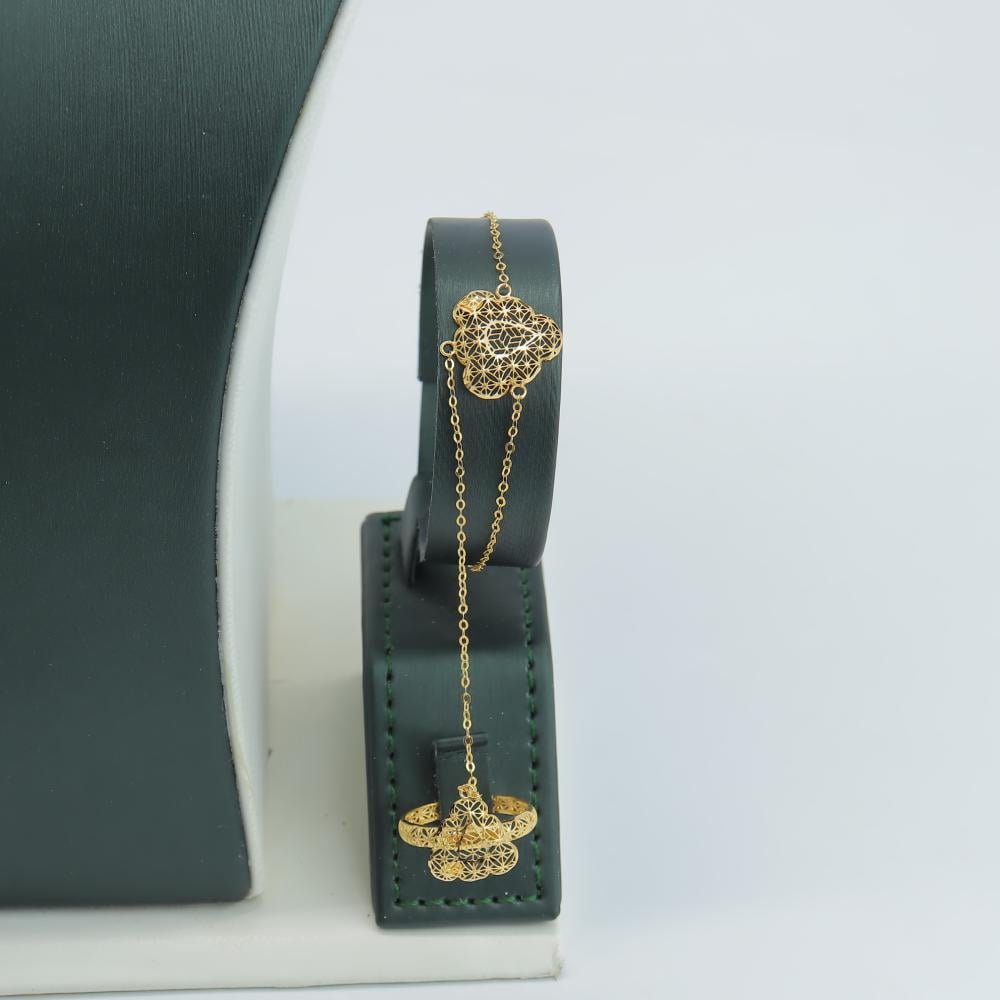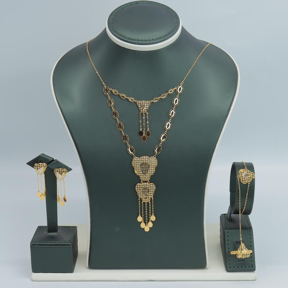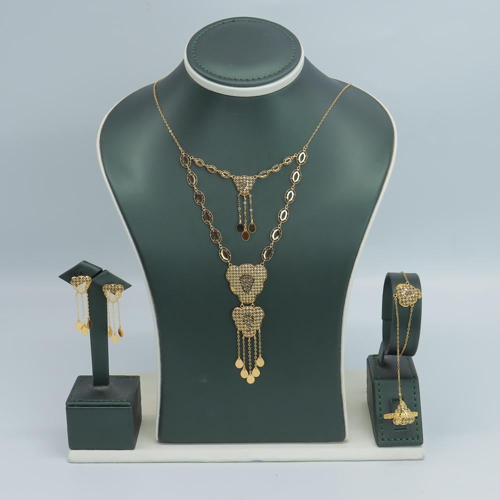 تفاصيل الطقم:وزن الطقم: جرامنقاوة الذهب: قيراطقياسات الطقم:- العقد/ سم- الخاتم/ 7 عربي 14 امريكي- الأسوارة/ سمقابلية التعديل: قابل للتعديليحتوي الطقم: عقد-خاتم-حلق-أسوارة
