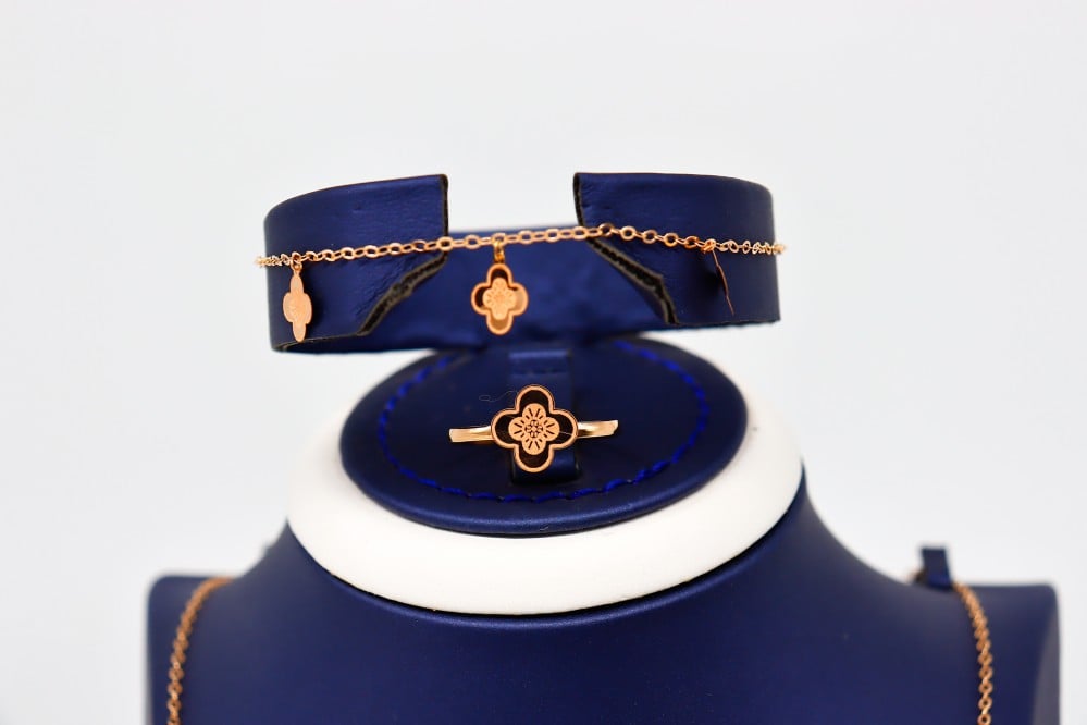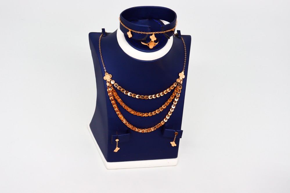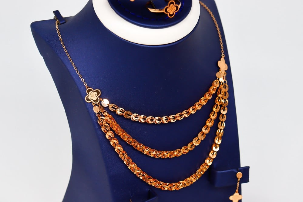 طقم تصميم وردة الفان كليف عيار 21 . طقم يتميز بتفاصيل فخمة بفضل تصميمها المبتكر المستوحى من الرقي والاناقة، صمم خصيصًا للباحثات عن التفرد في قطعهنّ من المجوهرات، صنع ليعبر عن اطلاله تليق بك سيدتي ، اطلبية الان واستمتعي بذهب يدوم لأجلك.