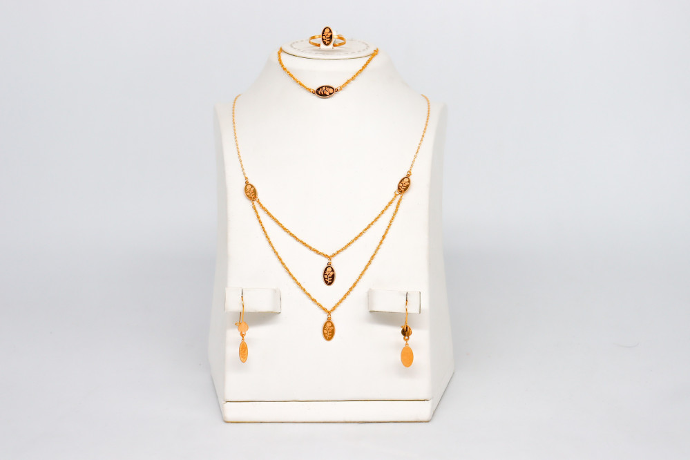 طقم ذهب سبيكه بيضاوي دورين عيار 21 بتصميمه الخيالي وبتفاصيله الجميله صنع ليعبر عن اطلاله تليق بك سيدتي ، اطلبية الان واستمتعي بذهب يدوم لأجلك.