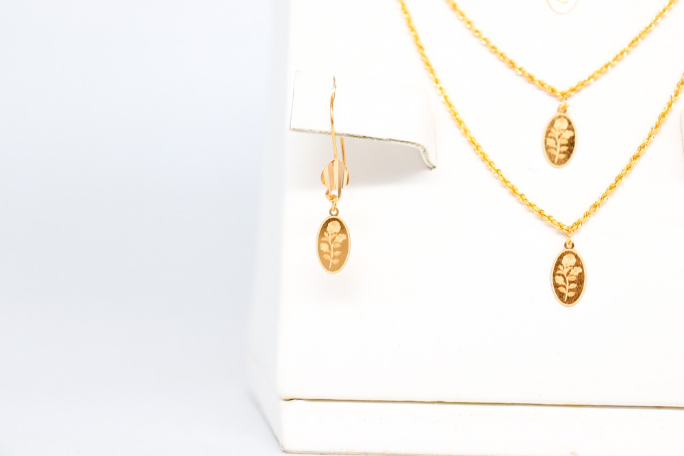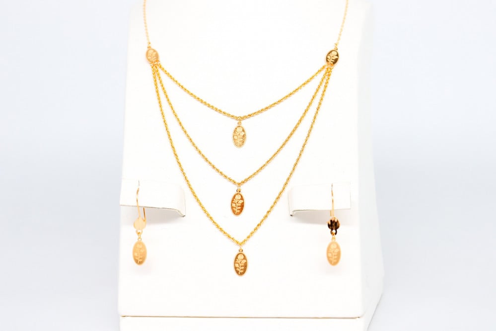 طقم ذهب سبيكه بيضاوي ثلاثه دور عيار 21 بتصميمه الخيالي وبتفاصيله الجميله صنع ليعبر عن اطلاله تليق بك سيدتي ، اطلبية الان واستمتعي بذهب يدوم لأجلك.