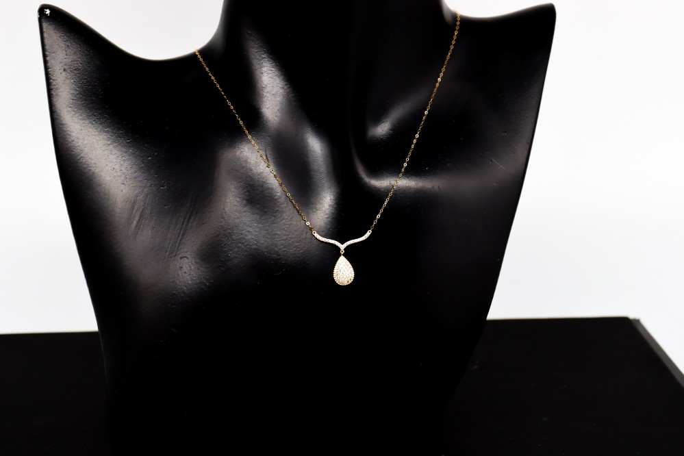 سلسال الدمعة تصميم الماسي عيار 18 بتصميمه الخيالي وبتفاصيله الجميله صنع ليعبر عن اطلاله تليق بك سيدتي ، اطلبيه الان واستمتعي بذهب يدوم لأجلك.