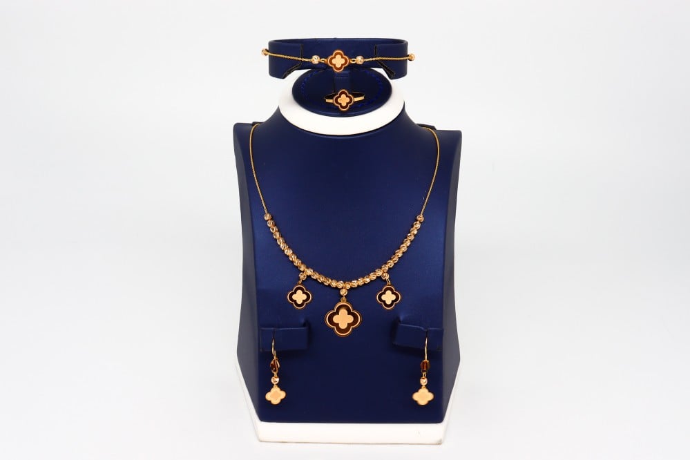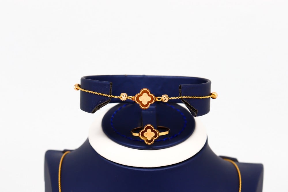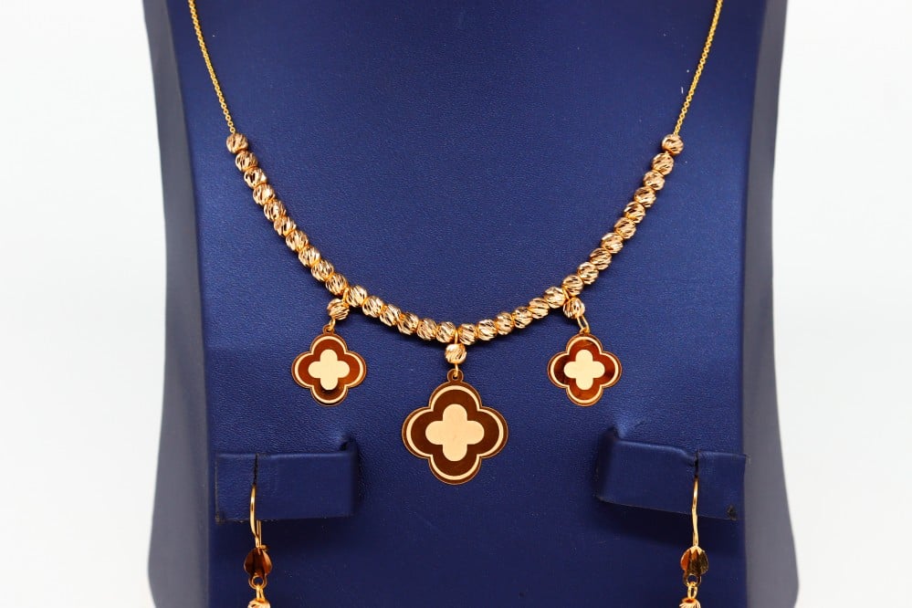 تألقي بفخامة مع طقم فان كليف الذهب المميز. بوزن 10.8 جرام، هذا الطقم يجمع بين الأناقة والرقي، ويضفي لمسة من الجمال على إطلالتك في كل مناسبة. تصميم ماركه فان كليف الراقي يخليكِ تبرزين بجاذبية وفخامة.