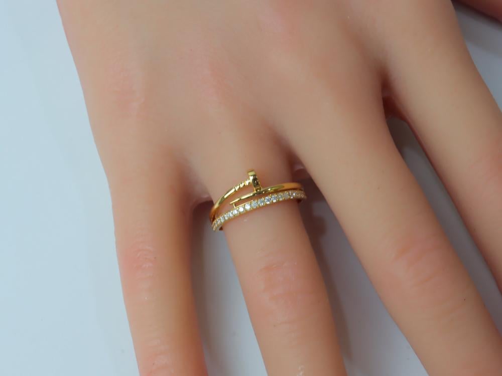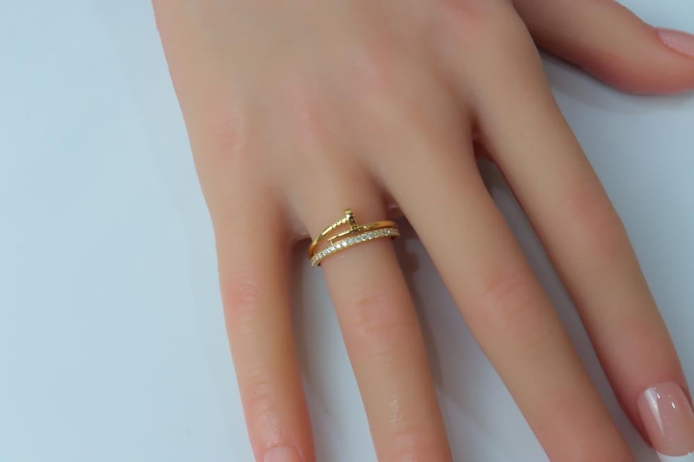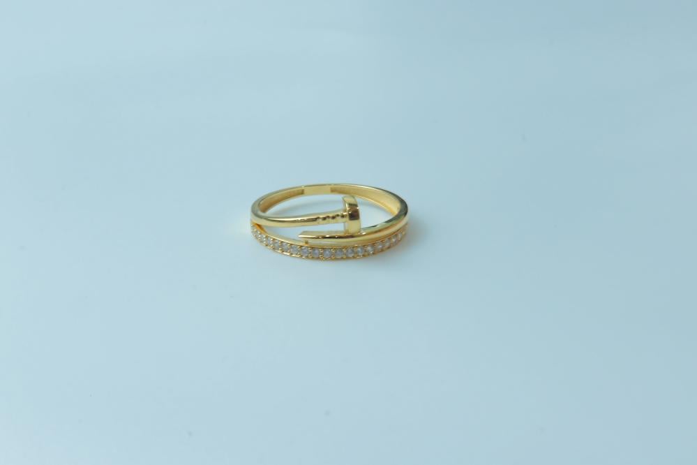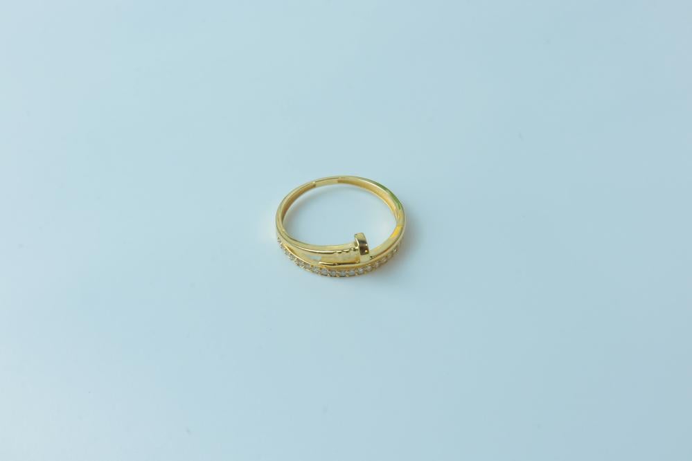 خاتم ذهب عيار 18 بوزن 1.7 جرام. يتميز بتصميمه العصري والأنثوي، حيث يأتي بتصميم الماسي يزين شكل المسمار، مما يضفي لمسة من الفخامة والرقي على إطلالتك. مناسب للإطلالات اليومية والمناسبات الخاصة، ويعتبر خياراً ممتازاً لمحبي التصاميم الفريدة.
