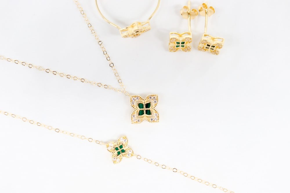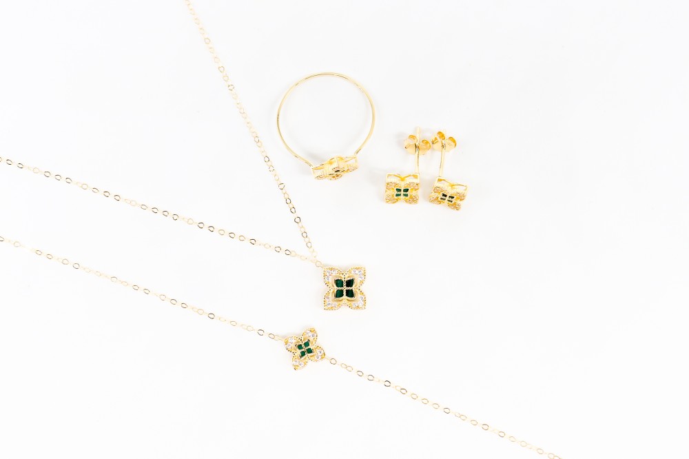 قطعة من السحر أضافها المُلهم روبيرت كوين لمجموعته من الزهور الرباعية المُزركشة، بألوانٍ مُحببة إلى النفس، والتي برغم بساطتها فهي ملفتة لكل من يسمع عن فن اختيار الهدايا روبيرت كوين الزيتي عيار 18 سلسال، خاتم، قرط، إسوارة