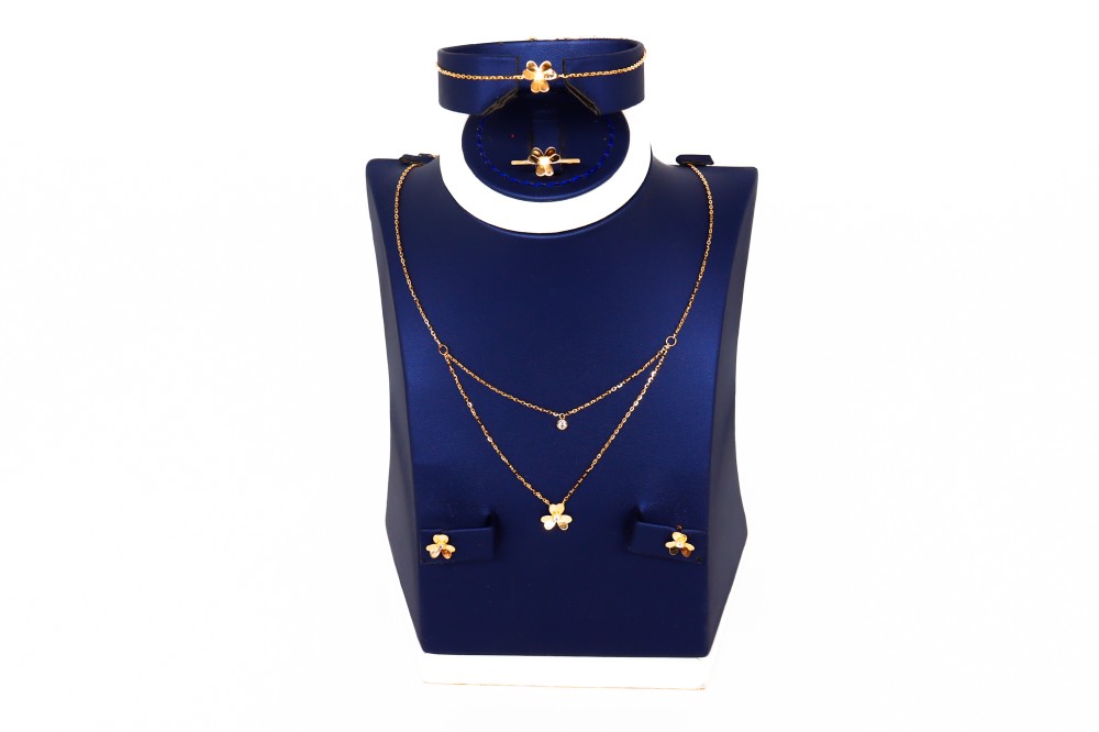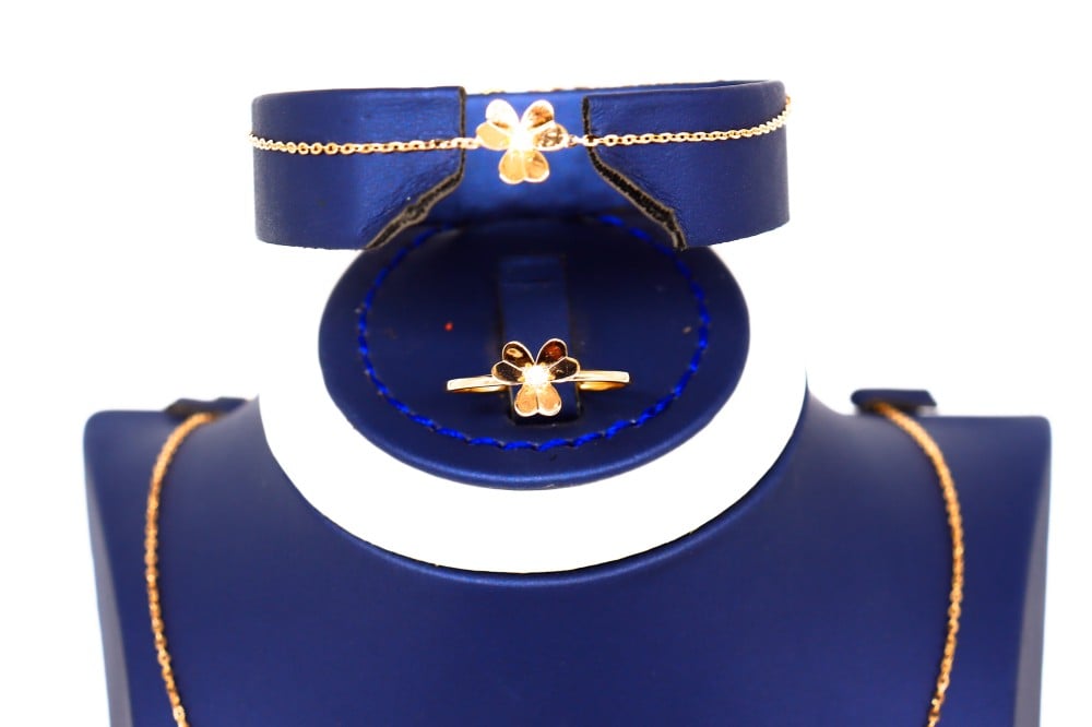 عندما يكون الجمال مُضاعفًا، يُطِلّ علينا طقم الوردة الدورين عيار 21، بروعة تصميمه ورُقيّ شكله، في طقمٍ مُميزّ مُكوَّن من سلسال دورين، إسوارة، قرط، خاتم، ارتسمي كلوحة فريدة.