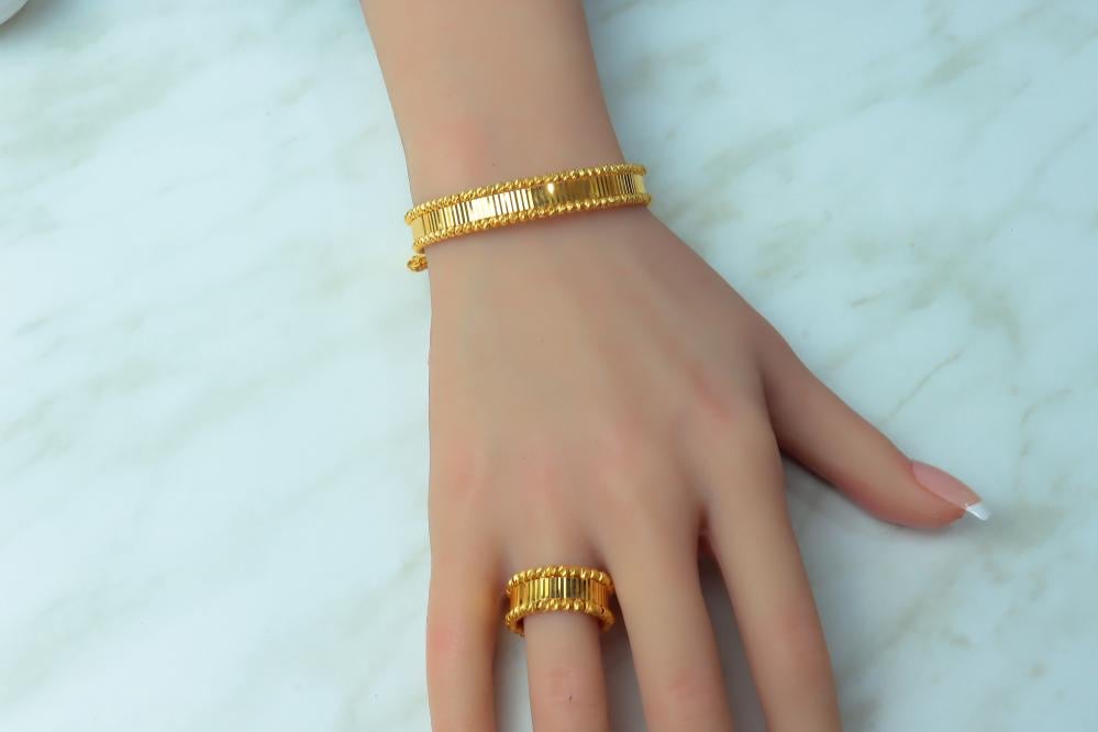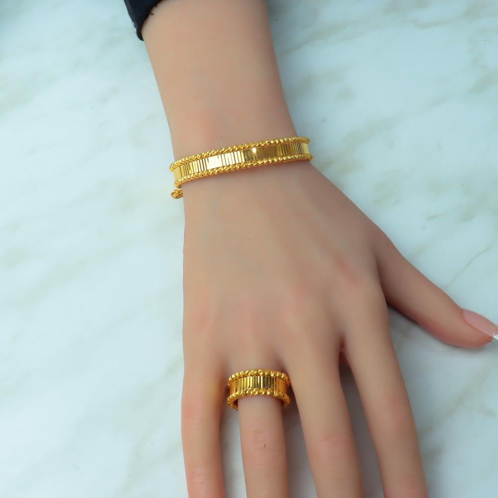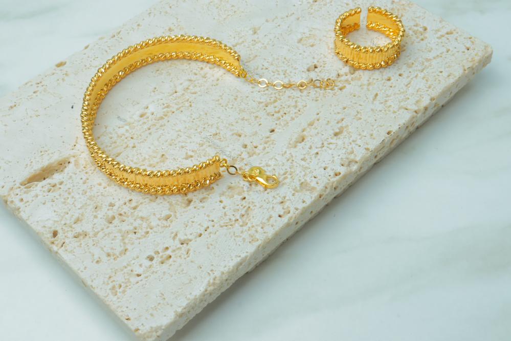 اسوارة مع خاتم ذهب عيار 21 بوزن 17 جرام تتميز بتصميم الدوربكاء اللى بيجمع بين الأناقة والفخامة، ليضفي لمسة فريدة على إطلالتك. يتميز التصميم بالتفاصيل المتقنة التي تعكس الحرفية العالية وتناسب كافة المناسبات الرسمية وغير الرسمية.