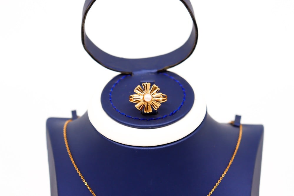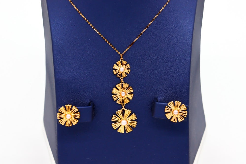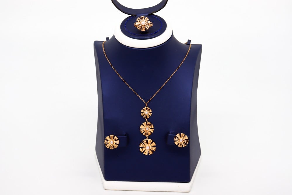 تفردي عن الكل بإطلالات لا تُنسى،أضيفي طقم ذهب شرقي عيار 21 هذا الى إطلالاتك واستمتعي بلمسة الفخامة والجمال التي سيضيفها لكِ. طقم يتميز بتفاصيل فخمة بفضل تصميمها المبتكر المستوحى من الرقي والاناقة، صمم خصيصًا للباحثات عن التفرد في قطعهنّ من المجوهرات، صنع ليعبر عن اطلاله تليق بك سيدتي ، اطلبية الان واستمتعي بذهب يدوم لأجلك.